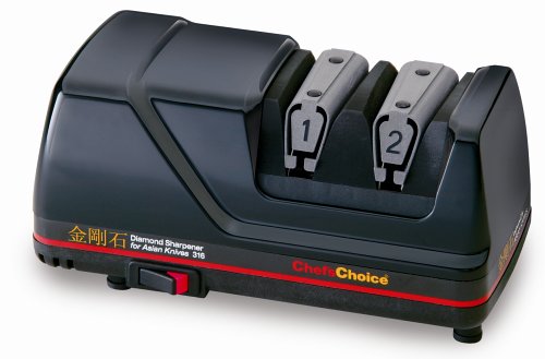>>>> Only Visit store to see price Best Buy Designed especially for Asian Style knives, the Chef's Choice 316 sharpener creates an Asian type factory edge known for its thin profile and razor sharpness. Asian chef's recognize this as the ideal edge for all brands of Santuko and other Asian cutlery whether you are preparing elaborate dishes of sushi or sashimi or filleting the catch of the day. Stage 1: Sharpening/Honing: 100% diamond abrasives sharpen and hone the knife's edge, creating the first facet. Diamonds make it fast and easy and .